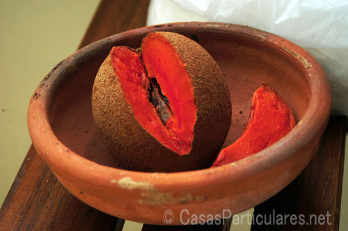 Se parece al mamey, pero es mucho más grande, tiene una cáscara áspera y si al comerlo no es lo suficiente maduro ¡puede ser indigesto y empachar! El color es claro, las semillas son pequeñas y brillosas, el sabor se parece al de una pera que han endulzado con azúcar de caña.